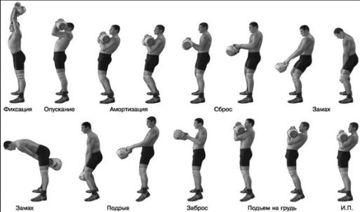 In der Startposition sind Kugelhanteln an der Brust fixiert, die Beine sind durchgestreckt. Die Fixierung auf der Brust muss bis zum Ausstoß gehalten werden. Diese Position